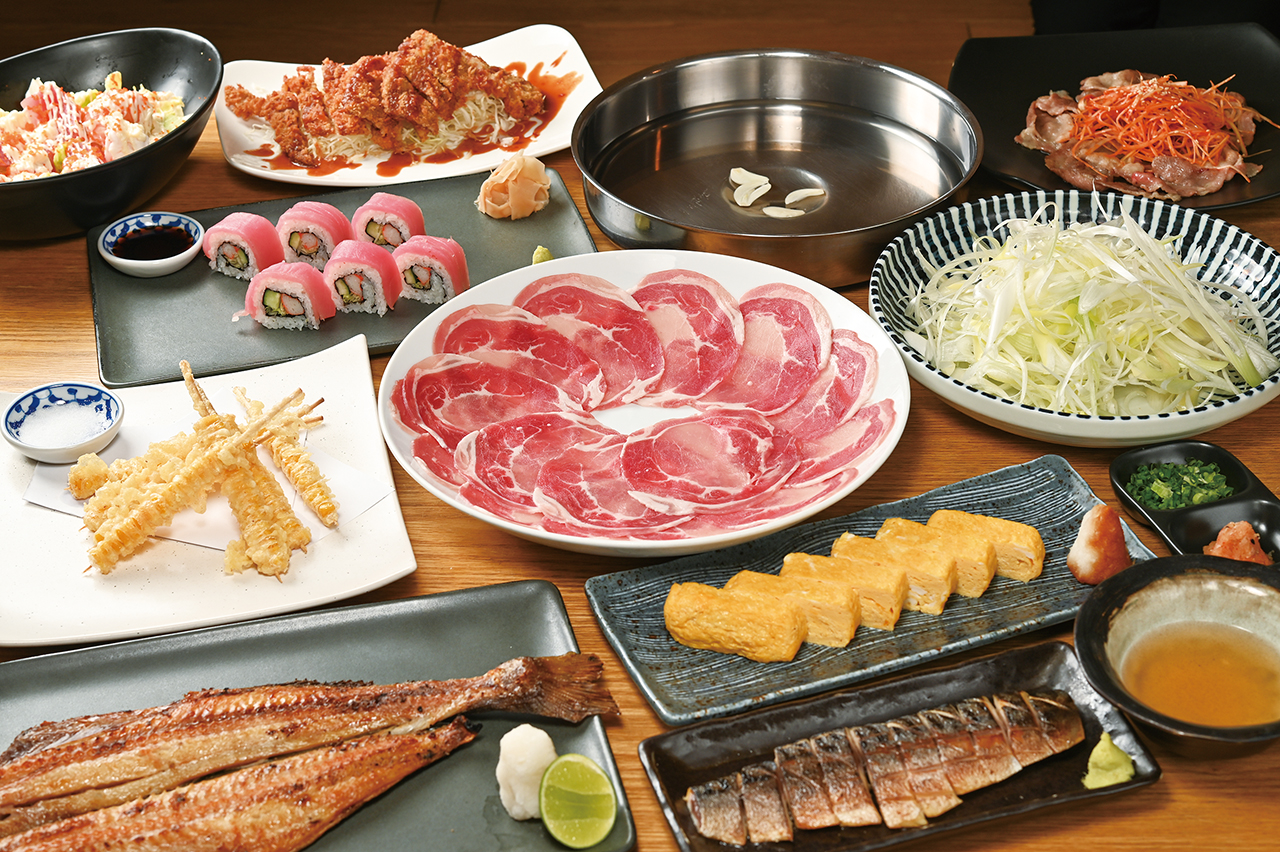 秘伝の出汁でいただく黒豚葱しゃぶしゃぶ(1人前490B)は〆の蕎麦付きで満足感もバツグン。注文は1人前からOK。ほっくり甘いとうもろこしの天ぷら(190B)、特製ソースがけ紙カツ(250B)、黒豚ピリ辛ネギ巻き(250B)など名物料理は数知れず