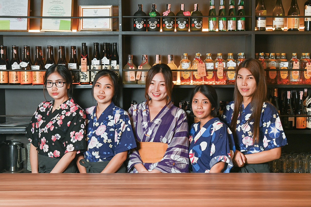 和のしつらえが落ち着く2階の個室では、靴を脱いでリラックス。3階に上がれば、知る人ぞ知るBarが出現。隠れ家的ムードでありながら、ドリンク一律150Bの明朗会計が嬉しい。
