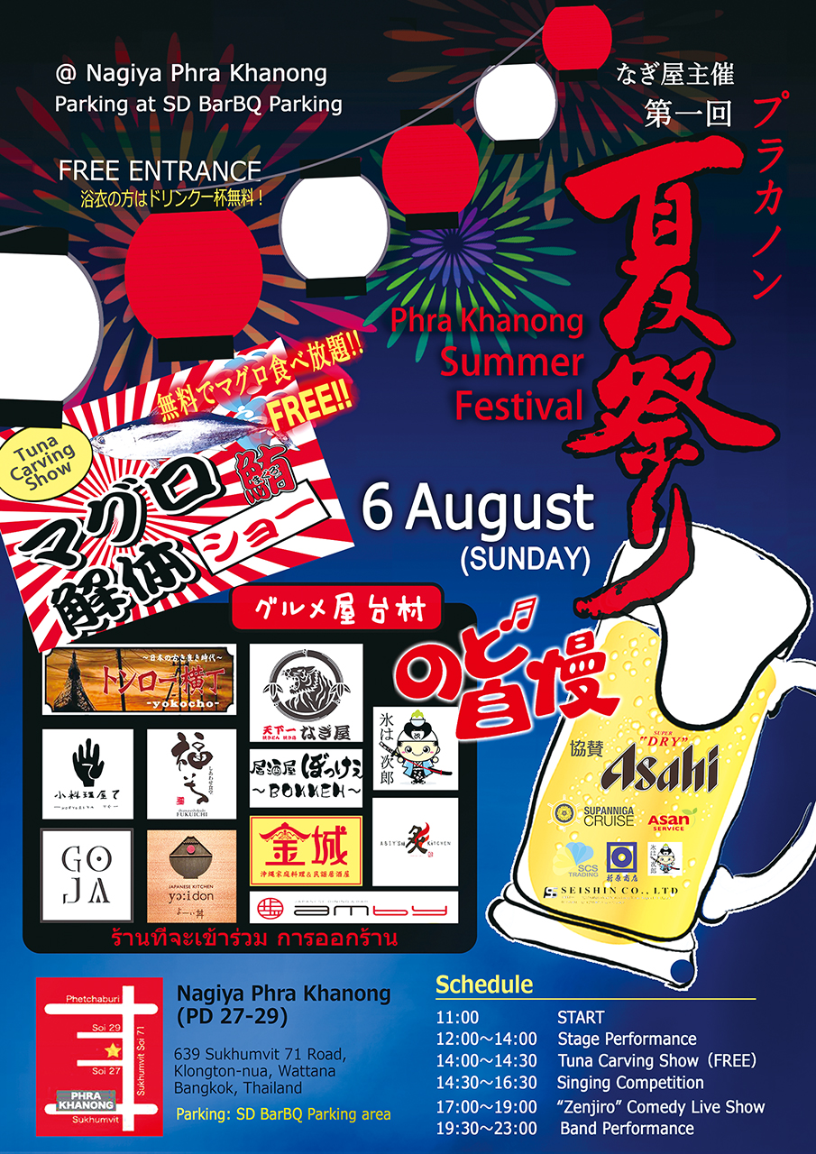8月6日(日)11時~深夜まで、1日中楽しめる企画が盛り沢山。まぐろの解体ショー(無料)、お笑いライブ、プラカノン周辺の日本食店による屋台飯、ヨーヨー釣りや金魚すくいなど、日本のお祭りそのままの雰囲気が楽しめそうだ。