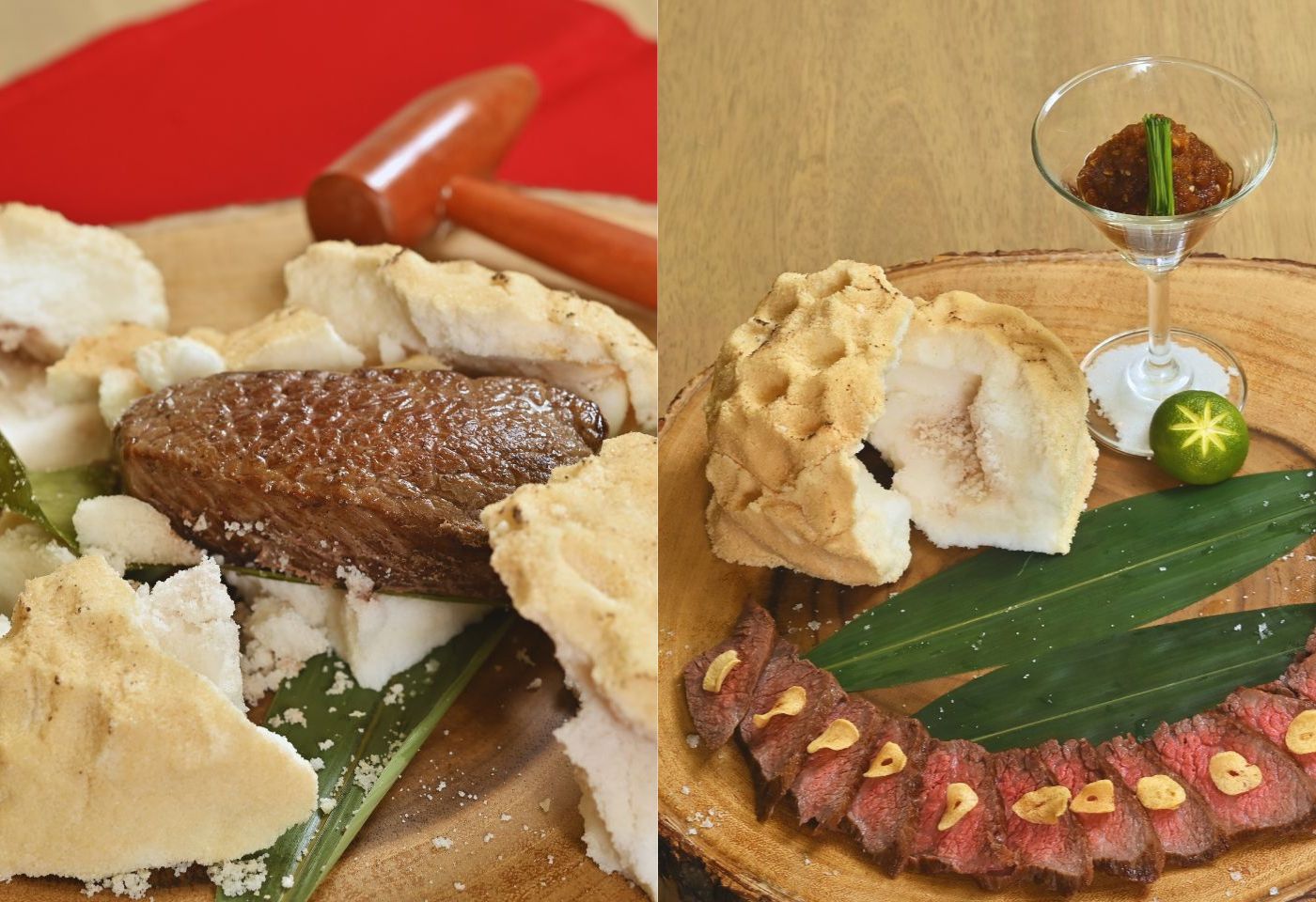 黒毛和牛の表面を焼き、特性ダレに1日漬けた後、低温加熱製法でじっくり肉にストレスをかけず火入れ。さらに1日寝かせ、塩釜で焼き上げる自慢の逸品