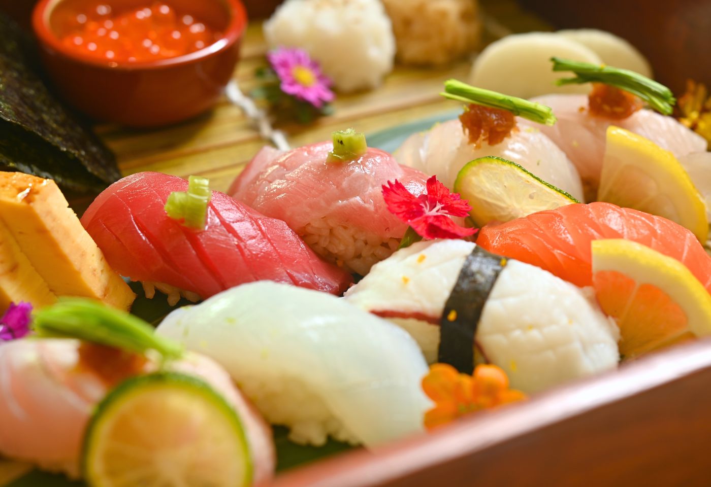 予約時に「バンめし見た!」で飲み放題が30分延長無料の2時間半に。その他おまかせコースは1500B~。詳細は公式LINEを確認しよう!ランチ時間も周辺で働く人の強い味方。「おまかせ寿司10貫とあら汁セット」が毎日10食限定で699Bと大変お得だ。