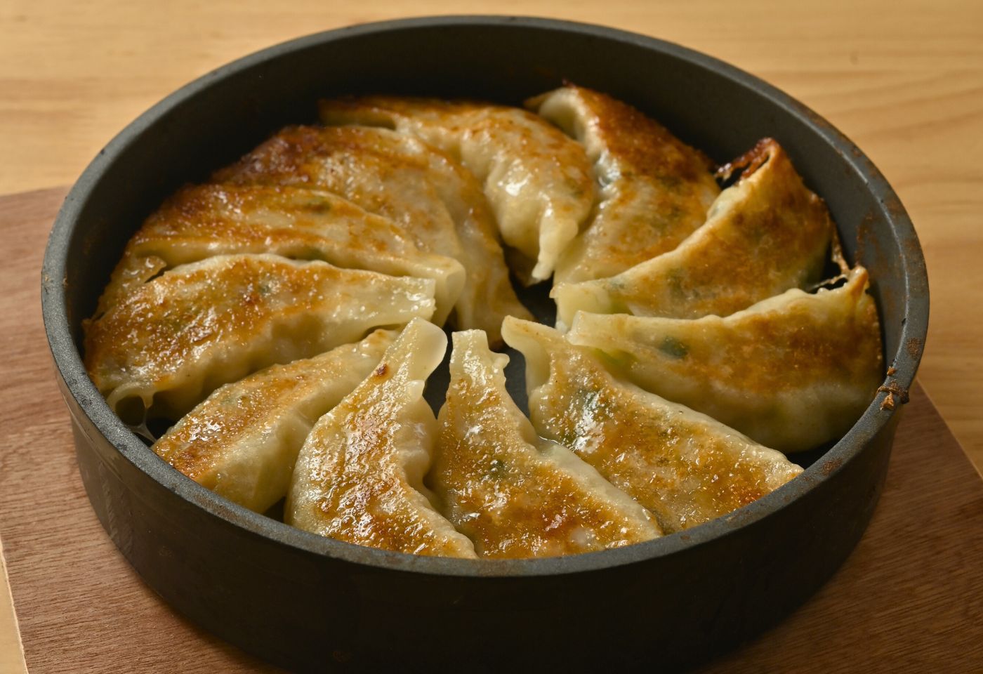 大人気の鉄鍋餃子(220B)柚子胡椒でどうぞ