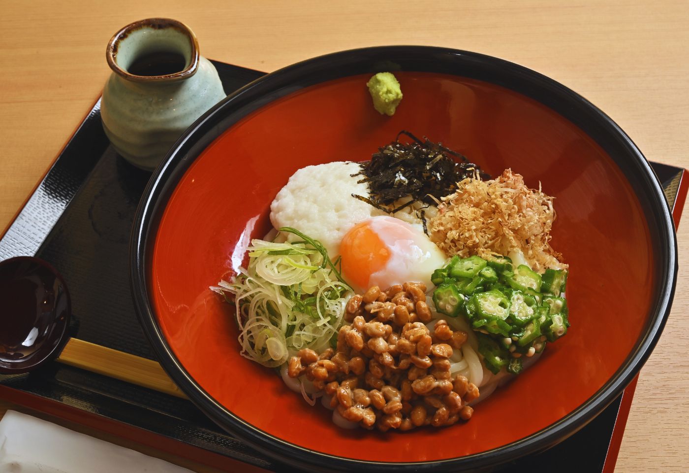 一年中暑いバンコクならでは納豆、とろろ、オクラが入ったスタミナ冷うどん