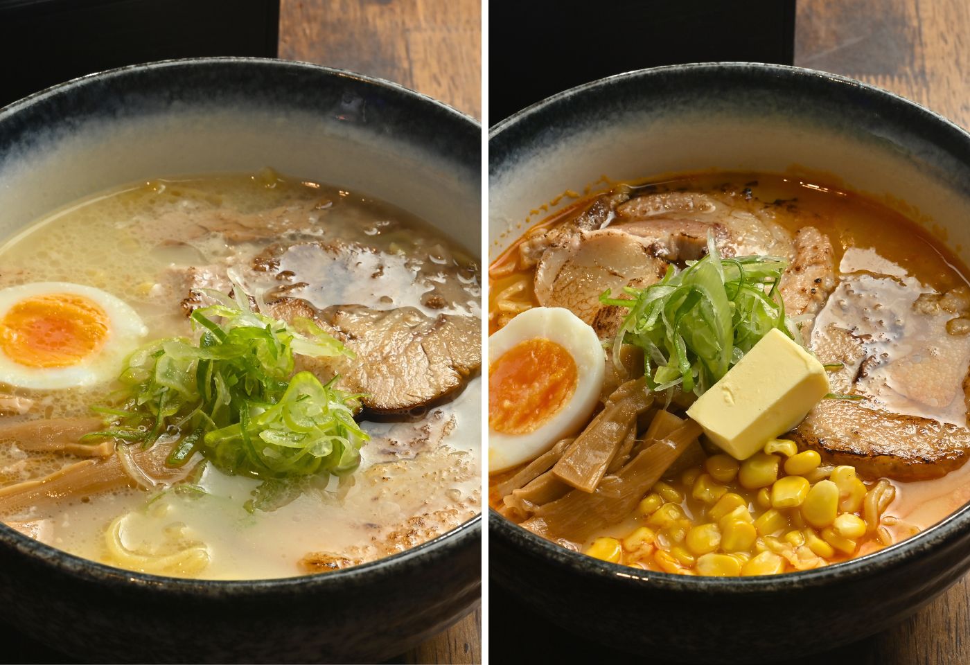 特製鶏白湯らーめん(208B)、味噌ラーメン(238B)どちらも〆に丁度良い。ハーフ、大盛りサイズあり