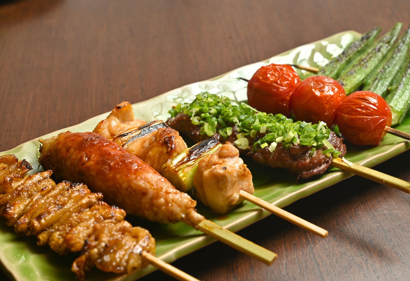 炭火で焼きあげた焼鳥はどれも1本から注文可能。とりかわ、つくね、牛ハラミ炙り串など35Bから