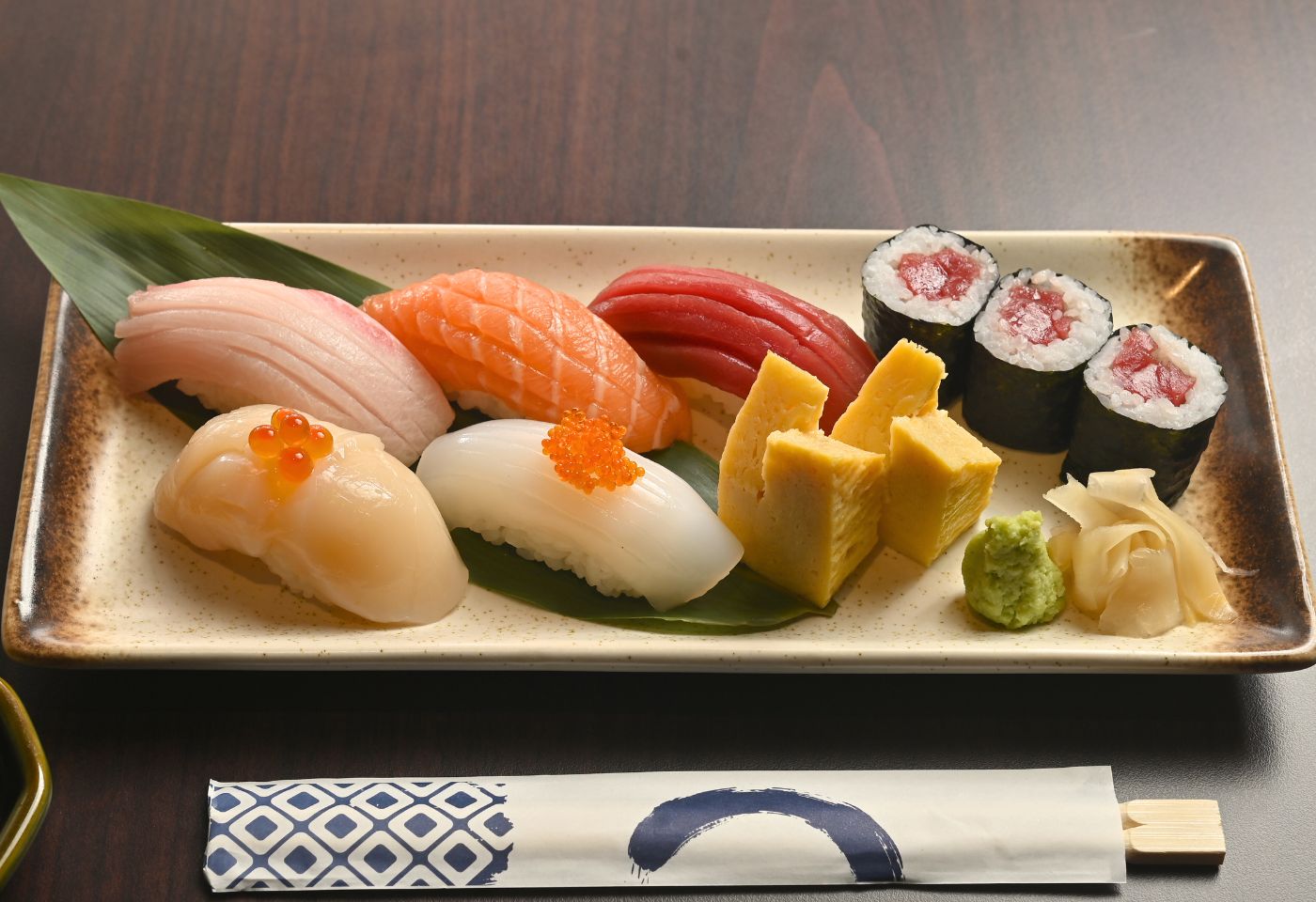 握り寿司6 種盛り合わせ(500B)寿司、焼きそば、エビチリなどメニュー豊富