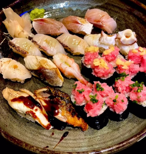 高さ150cmの小さな扉の先に広がる、高級感漂う鮨居酒屋。職人歴30年以上の熟練の技が光る本格寿司と刺身、備長炭で焼き上げる焼き鳥のほか、居酒屋メニューも豊富に揃う。ランチには海鮮メニューも充実。個室完備で接待や会食にも◎