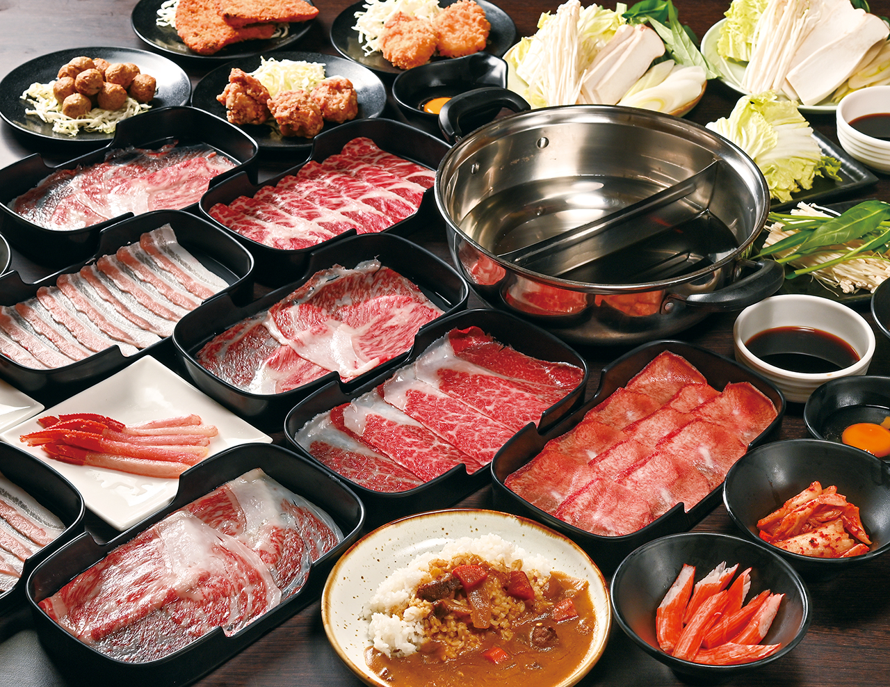 和牛赤身、上タン薄切り、霜降り和牛などの食べ放題850Bや、豪州和牛サーロイン、カルビ、肩ロースなどの食べ放題500Bがあり、家族と友達と気軽にワイワイ満腹必至。+299Bでアルコールあり飲放題も。