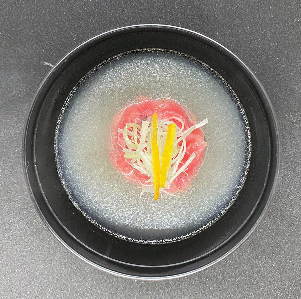 会席コースの椀物浅利ビーツラビオリと120gの蛤が入る。蛤は一番出汁とフレンチの手法でとった浅利のジュをブレンド