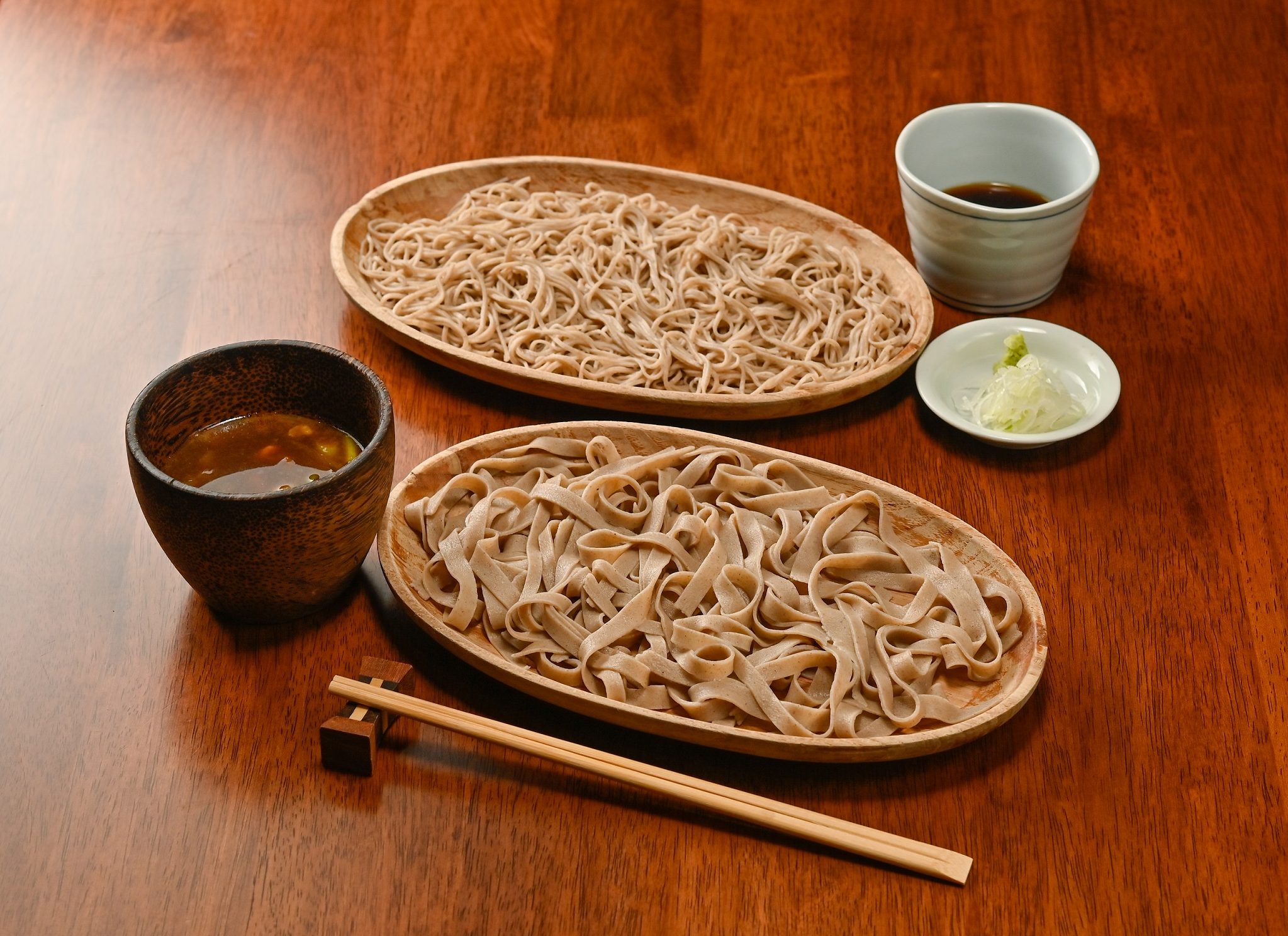 もり蕎麦(260B)と鶏ガラつけ蕎麦(320B)香り高い日高昆布を使用したつゆのほか、鶏ガラベースの白湯つゆも人気。つゆに合わせて麺を打ち分けている
