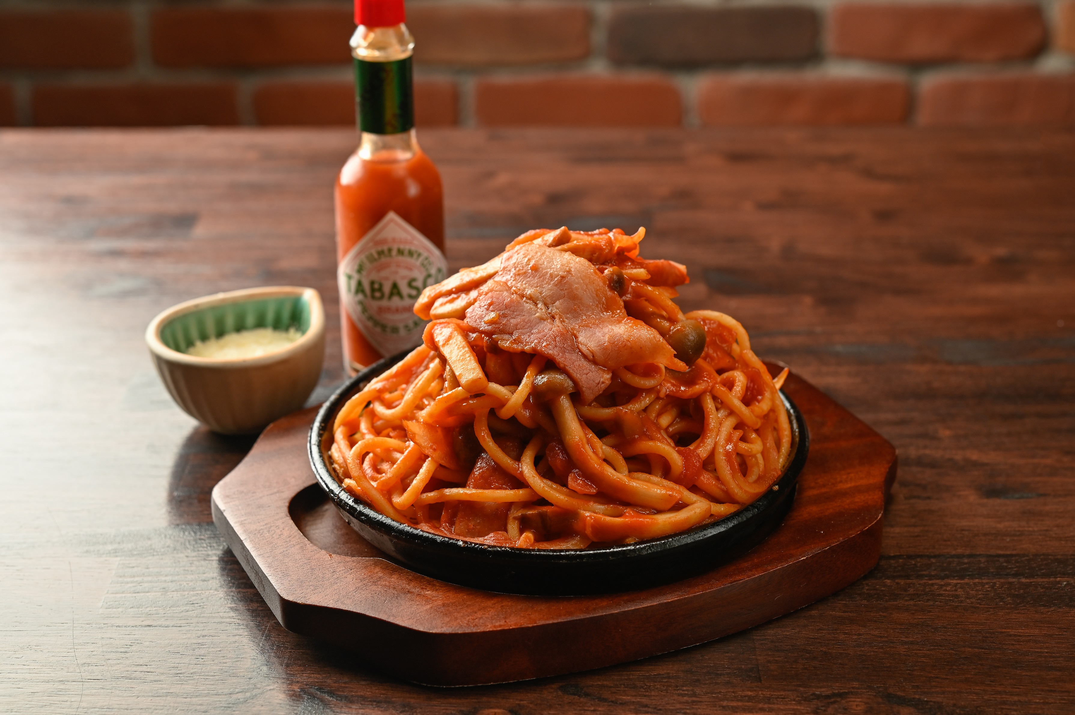 鉄板ナポリタン(210B)昔懐かしナポリタンを薄焼き卵でくるんだ、愛知発祥のB級グルメ。飲みの〆にも人気