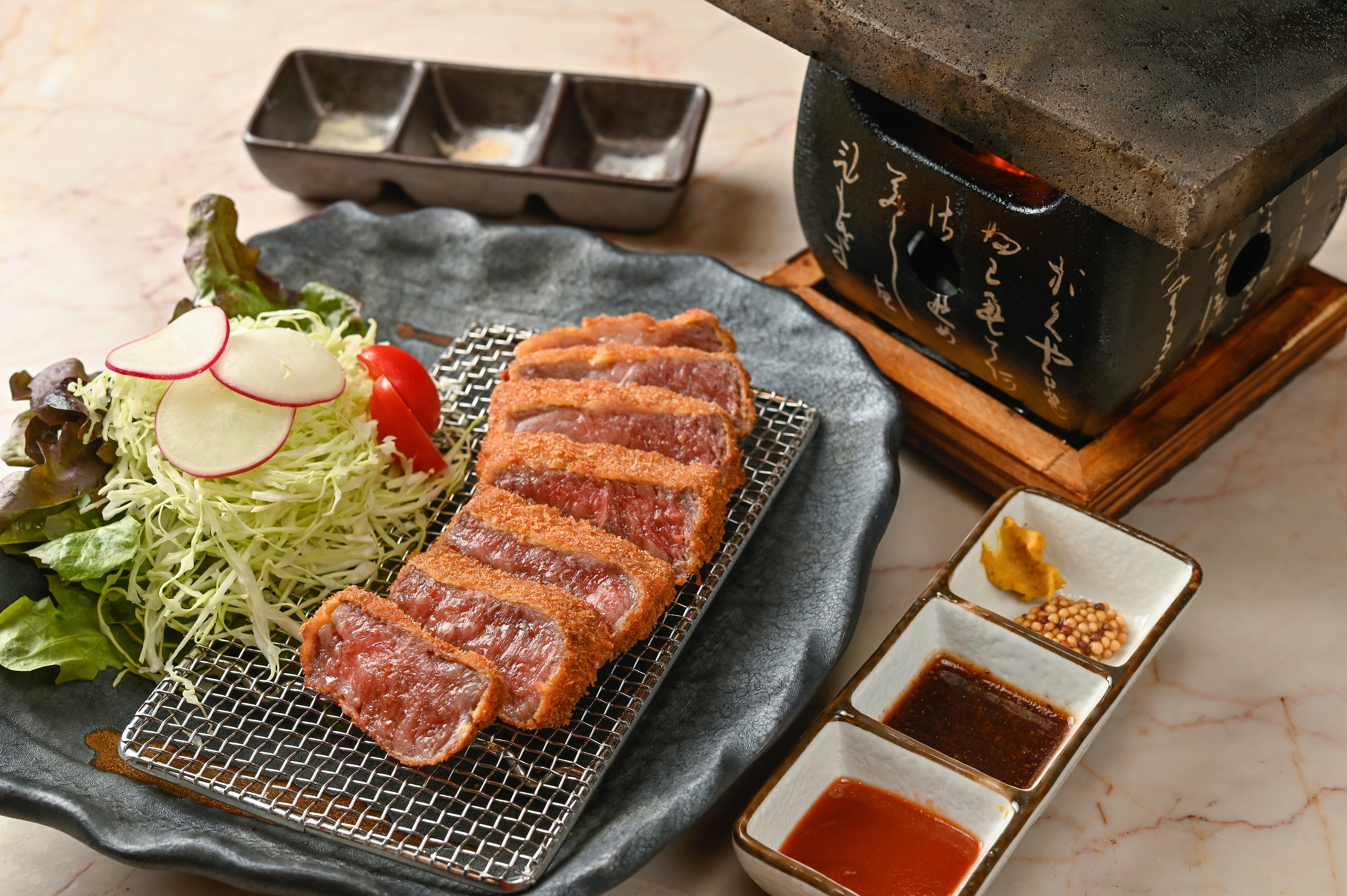 和牛サーロインかつ(1,580B/150g)微細に挽いたパン粉をまとわせた和牛を極レア仕立てに、肉汁と旨みを閉じ込めた逸品