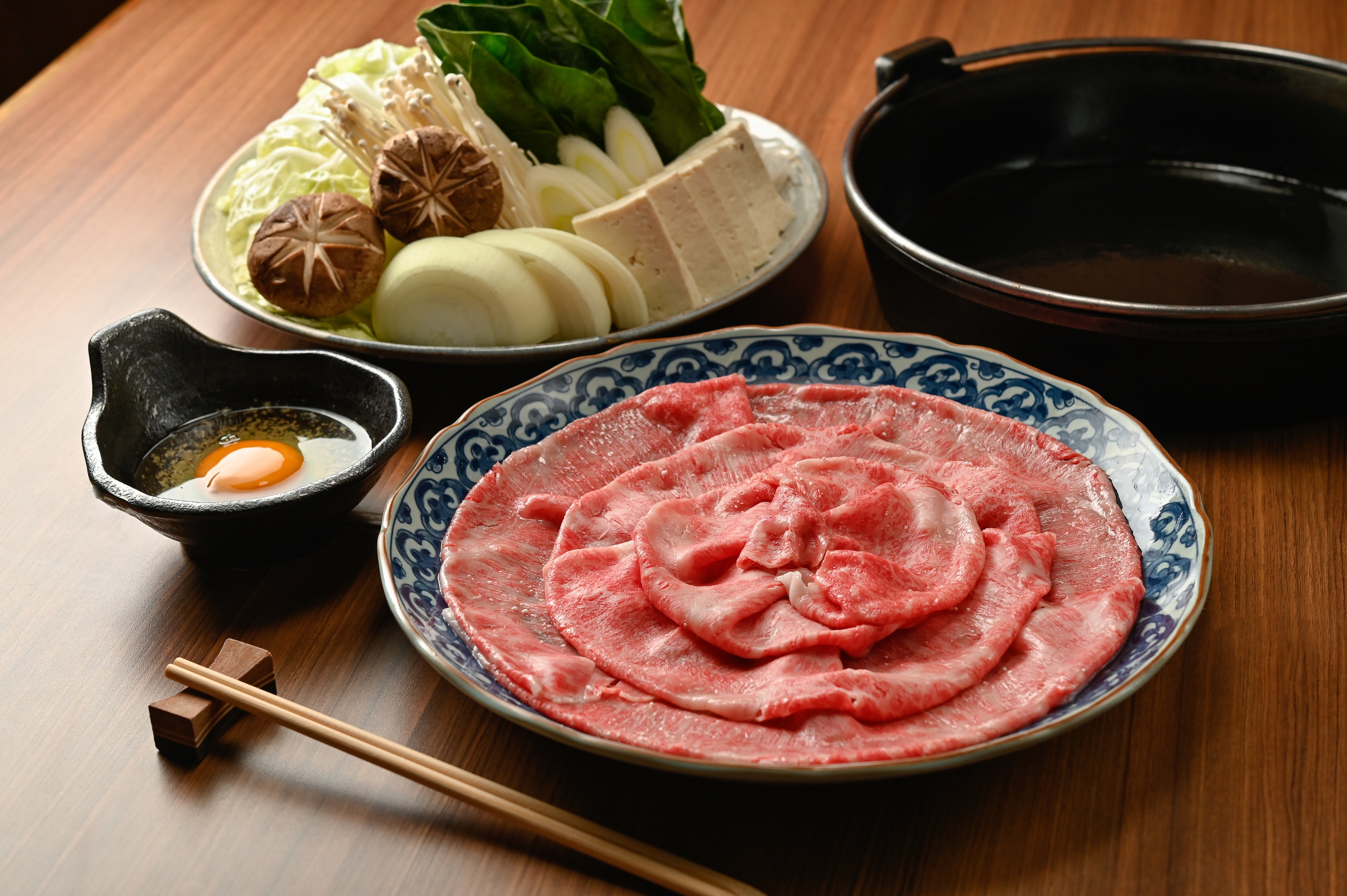 すき焼き(1人前980B~)黒毛和牛の上品な甘みが口いっぱいに広がる贅沢な一品。これを求めて来店するリピーターも多数