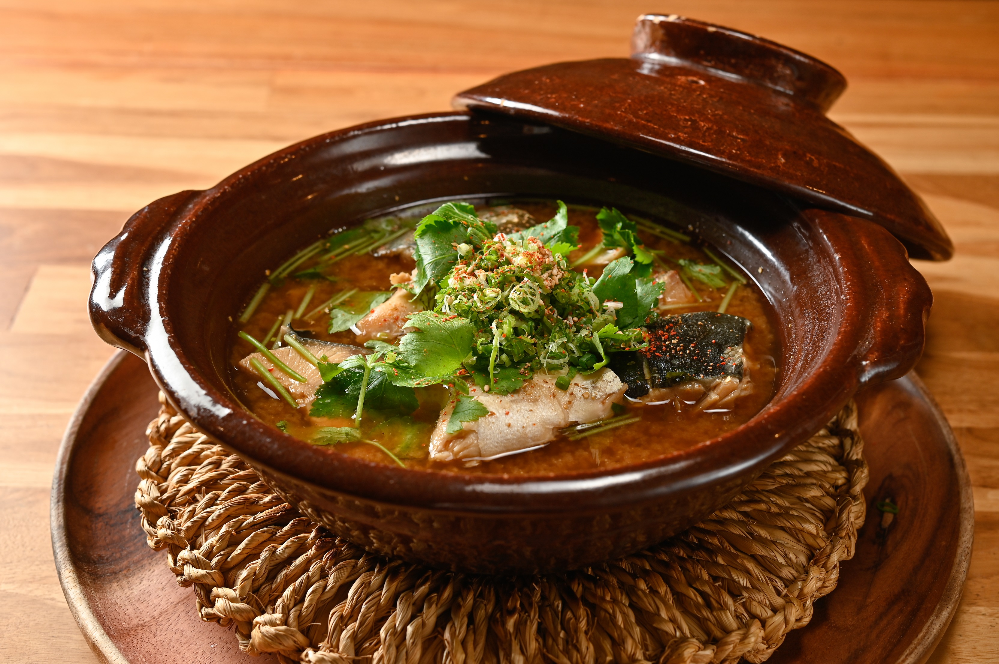 土鍋アラ汁(299B/ハーフ199B/ミニ99B)鮮魚の骨、大量の野菜の皮などから出る栄養と旨みを、じっくり丁寧に引き出した黄金のスープ