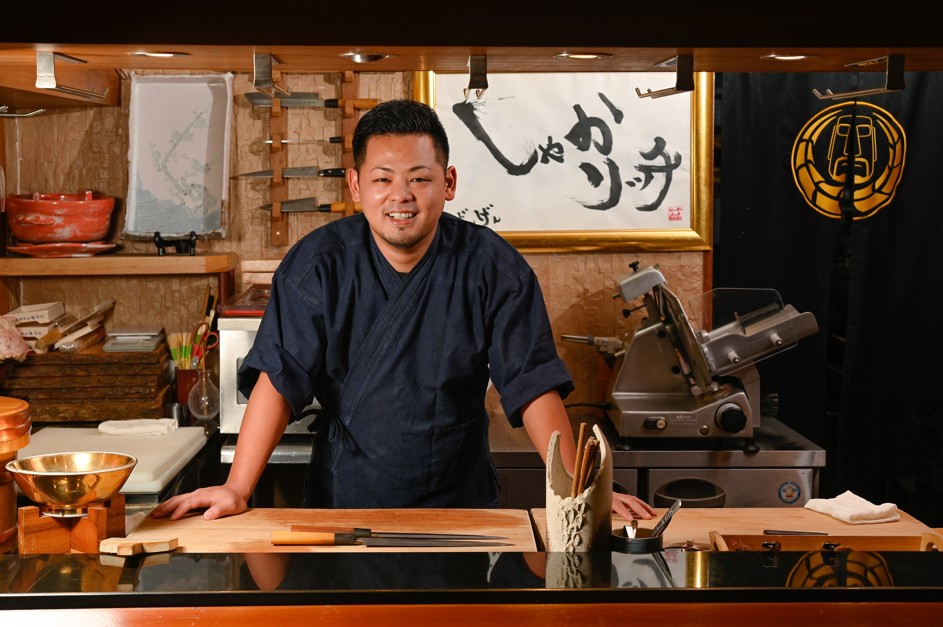 実家は自営で、物心ついた頃から仕込みの手伝い。楽しいと思ったことはありません。なのに同じ道を志し、自然とこの世界に入っていました。最初に修業したのはホテルのフレンチで、この時の経験が自分の背骨になっています。以降はジャンルを固定せず、西洋料理や居酒屋、B a rと縦横無尽に駆け巡り、「バーテンダーなら頑張り次第では半年で一人前になれる」の言葉に背中を押され、24歳で独立。当然そんな容易なものではなく、商売の難しさを感じ始めた頃、先輩に「酒は水を売るだけではない」と言われたんです。そこからは全国の酒蔵に足繁く通い、造り手と会い、その方たちの人間性や情熱や努力に、直に触れました。日本酒が何万年もの歴史と文化 を背負っていること、それを一杯の酒を通して味わってもらうのだと知れたことは、今に繋がる大きな糧となったと思います。また当時、地酒と共に日本各地の郷土料理に興味を持ったことは、現在の創作スタイルにも繋がっています。その後は名古屋市に「駅前ホルモンあらた」をオープンし、今年で16年目を迎えました。いま何を求めているのか?ニーズはどこにあるのか?料理を作りながらも経営者として絶えず観察しつつ、伝統的な日本の食文化や新しい価値観を一皿に込め、ここタイでも発信できたらいいと願っています。自慢の一品