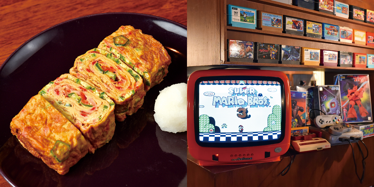ファミコンやプラモが並ぶレトロな店内。誰もが童心にかえって楽しめる、まさに大人の秘密基地”だが、あの頃と違うのは、傍らにうまい酒と肴があること。