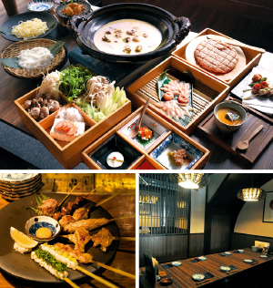 炭火の焼き鳥が人気の地鶏料理専門店。タイ北部の契約農場から仕入れる新鮮な鶏を職人が一羽一羽丁寧にさばき、高級炭で香ばしく焼き上げます。シックな内装で、ジャズが流れる店内は、落ち着いた雰囲気で、気軽な会食に◎地鶏家けんぞう