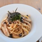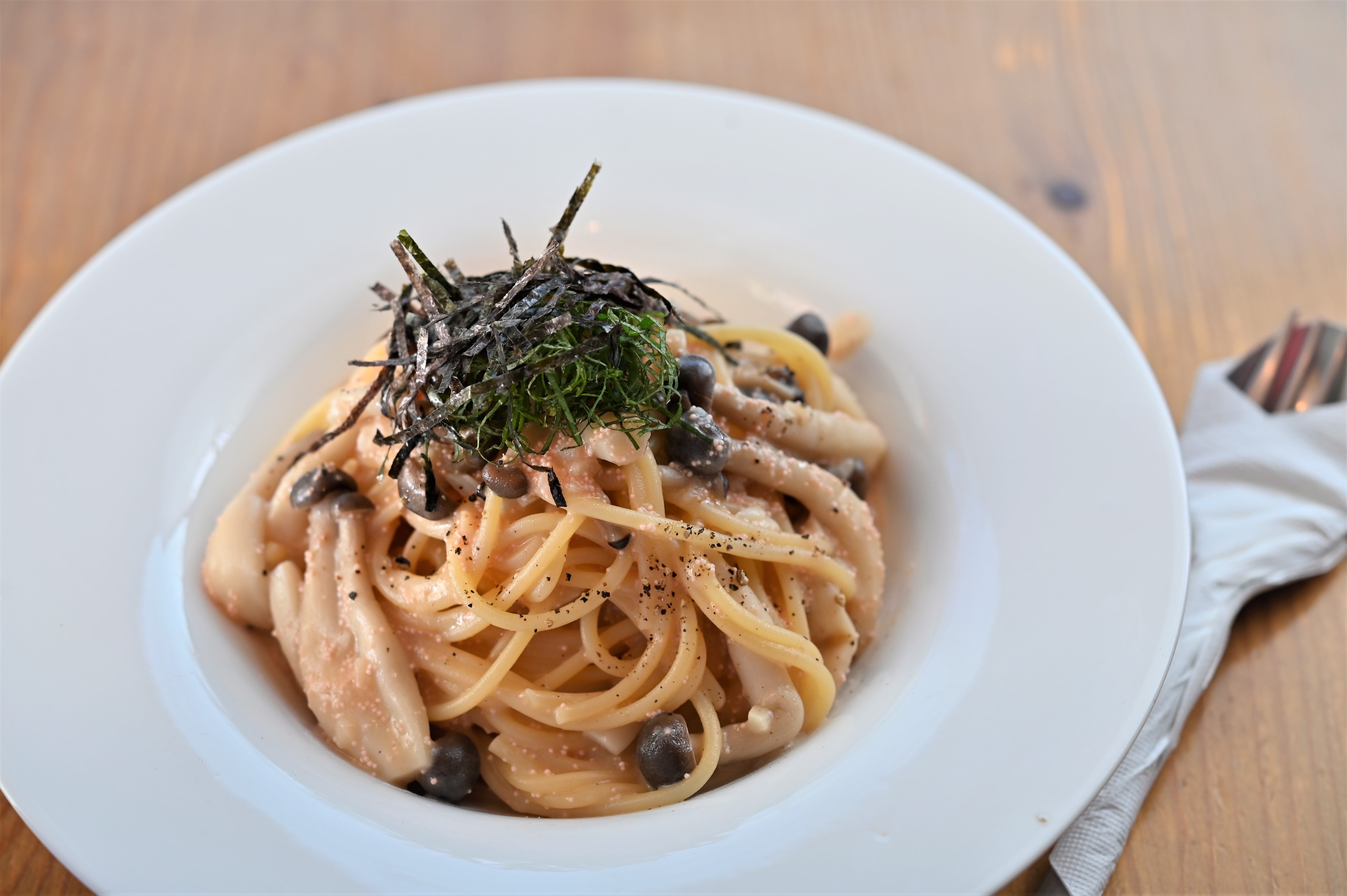 クリーミーな満足感もありながら、青じそとレモンの香りが軽やかな印象を与える「シメジと明太子のパスタ」(239B)