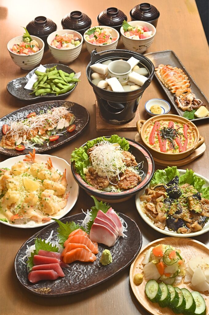 ・枝豆 ・鶏ささみのバンバンジー ・カプレーゼ ・しらすやっこ ・オクラ・人参胡麻和え ・刺身5種盛り(まぐろ、ぶり、サーモン、蛸、〆鯖) ・おでん鍋 ・鶏もも西京味噌焼き ・ねぎとろ椎茸焼き ・海老・蓮根はさみ揚げ ・やわらか手羽先唐揚げ ・もろこし揚げ ・海鮮ちらし丼 ・豆腐・わかめの味噌汁 ・フローズンまるごとイチゴ ※写真は「ばんやコース」です