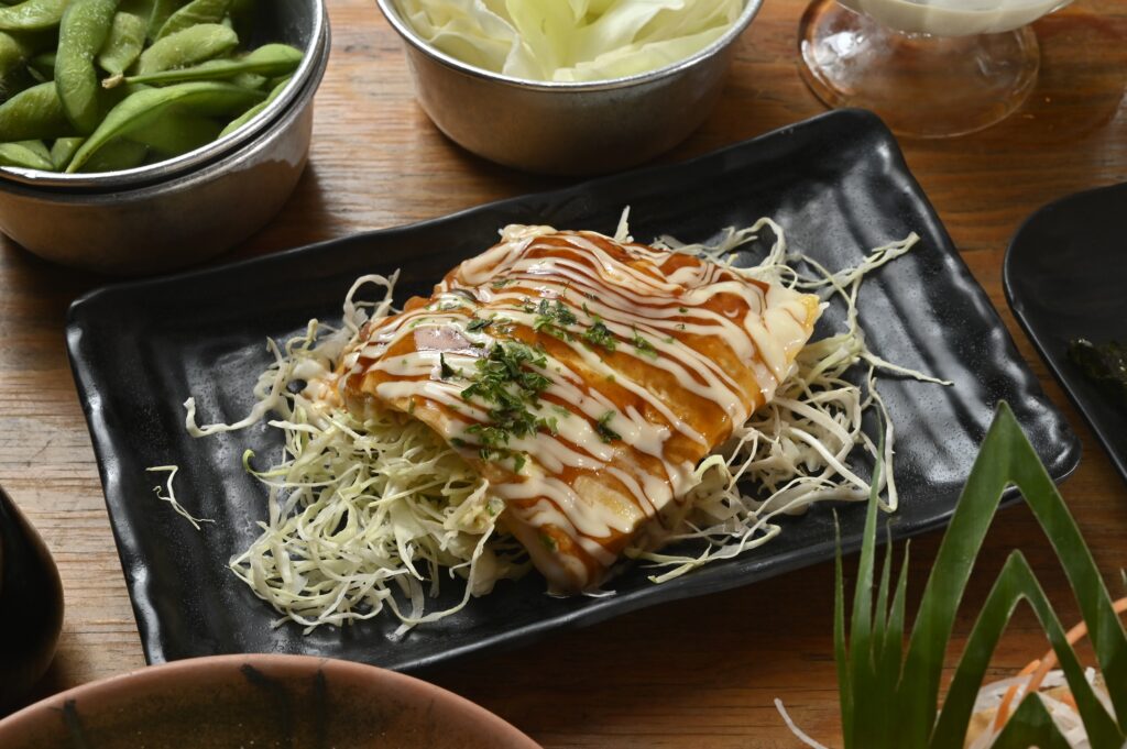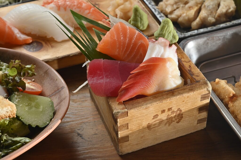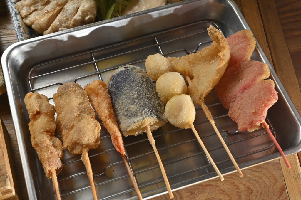 ・枝豆 ・シーザーサラダ ・串カツ5本(豚肉、鶏肉、エビ、野菜、キス) ・キャベツ ・刺身4点盛り(マグロ、サーモン、シメサバ、ホッキ貝) ・とん平焼き ・サーモンおにぎり ・アイスクリーム