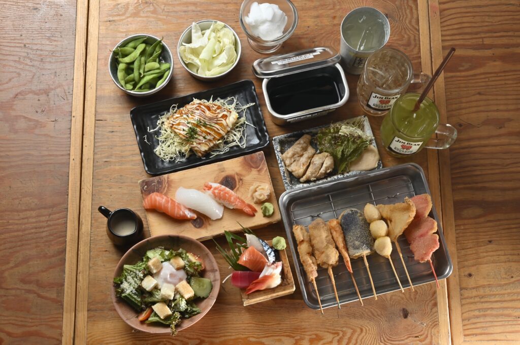 ・枝豆 ・シーザーサラダ ・串カツ7本(豚肉、鶏肉、エビ、野菜、キス、紅生姜、ウズラ) ・キャベツ ・チキン南蛮 ・寿司 3貫(サーモン、イカ、エビ) ・刺身5点盛り(マグロ、サーモン、シメサバ、ホッキ貝、タコ) ・とん平焼き ・アイスクリーム