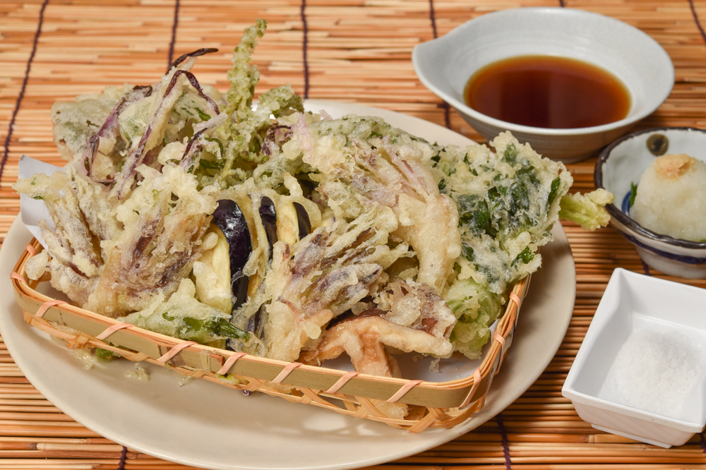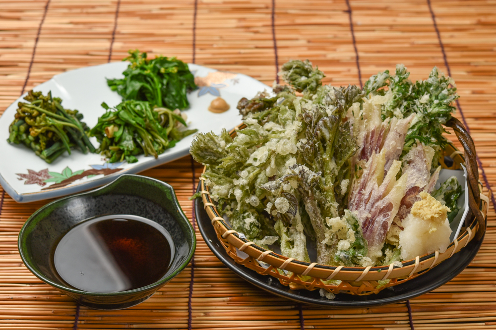 ふきのとう、こごみ、たらの芽など、山の息吹をシンプルに堪能する「山菜の天ぷら」はマストオーダー。肉厚な山菜を覆う黄金色の衣はどこまでもサクッとふっくら、食べ進めるほどにほろ苦さとすがすがしい香りが立ち上り、なんとも滋味深く格別の味わいだ。人気の双璧をなすのは「山菜のおひたし」。薄味仕立てが素材の力を引き立て、これまた絶品。