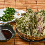 揚げたてがたまらない山菜の天ぷら(Sサイズ330B~)、山菜のおひたし(390B)も沁み入る旨さ