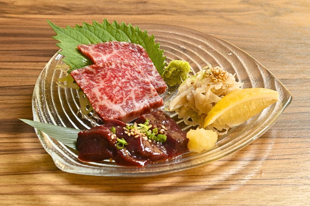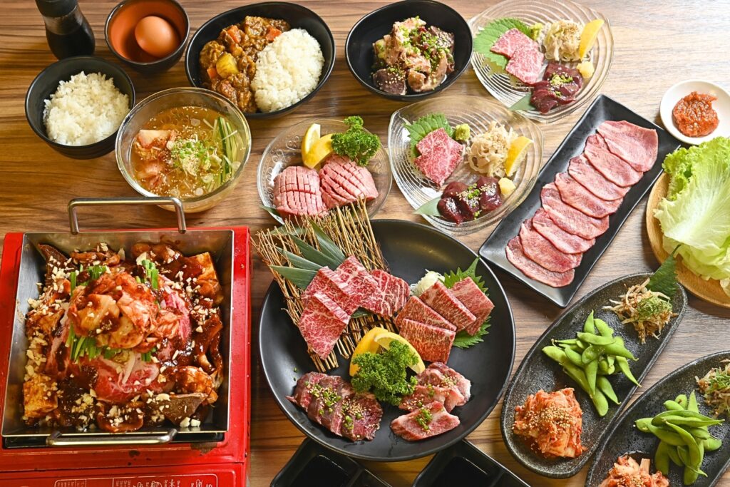 ・ホルモンMIX(食べ放題) ・前菜盛合わせ ・レバ刺し ・ネギ塩タン ・AUS和牛カルビ ・AUS和牛ハラミ ・サンチュ(おかわりOK) ・卵かけご飯 ※食べ放題の内容はコースにより異なります。詳細はお問合せください。