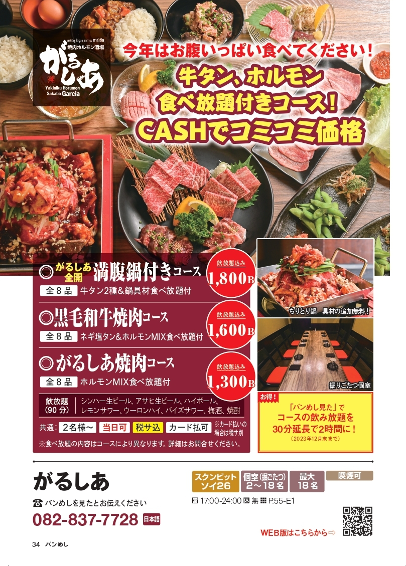 シンハー生ビール、アサヒ生ビール、ハイボール、レモンサワー、ウーロンハイ、バイズサワー、梅酒、焼酎最低人数 |2名様より 最大人数 |18名様まで カード払 |可 予約 |当日可 消費税 |込(現金の場合) サービス料|込(現金の場合) ※カード払いの場合は税サ別 喫煙 |可