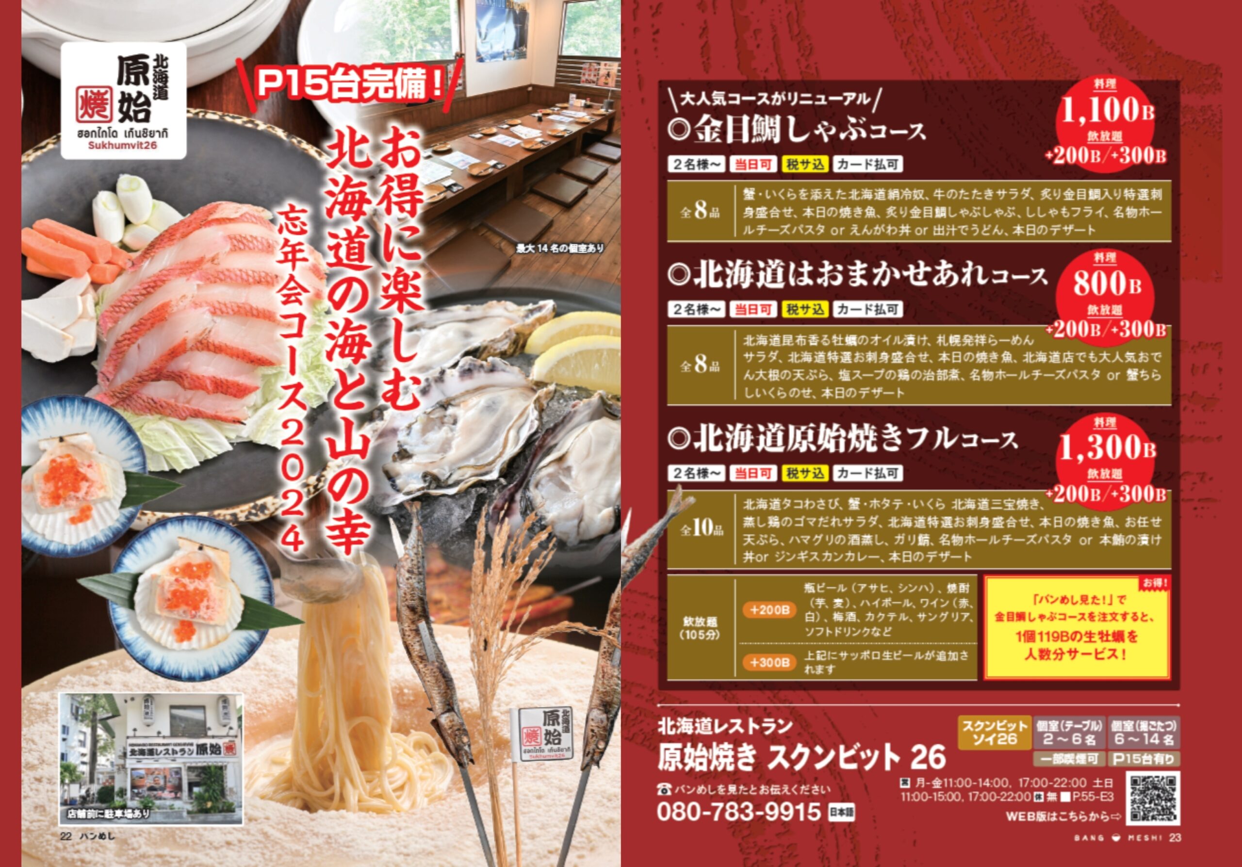 +200バーツ:瓶ビール(アサヒ、シンハ)、焼酎(芋、麦)、ハイボール、ワイン(赤、白)、梅酒、カクテル、サングリア、ソフトドリンクなど +300バーツ:上記にサッポロ生ビールが追加されます最低人数 |2名様より 最大人数 |14名様まで カード払 |可 予約 |当日可 消費税 |込 サービス料|込 喫煙 |一部喫煙可