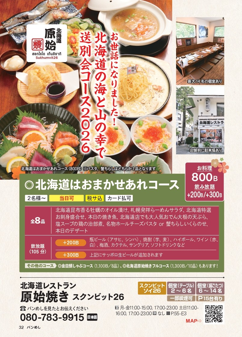 >金目鯛しゃぶコース1,100バーツ >北海道はおまかせあれコース800バーツ >>送別会2026店舗情報