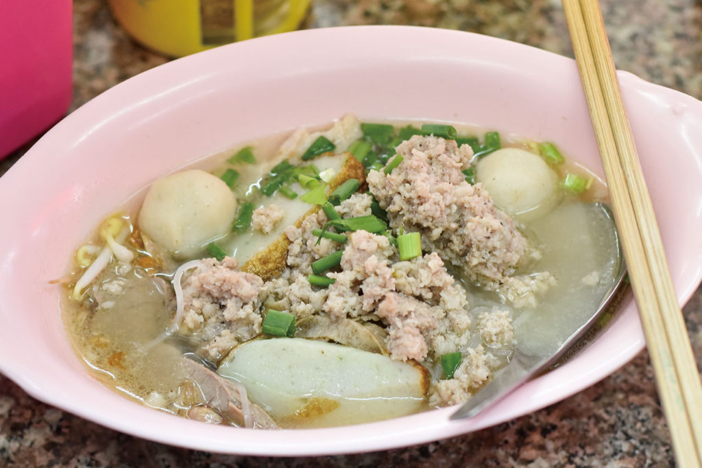 スクンビット・ソイ26に構えるクイッティアオ食堂(クーラーなし)。2軒並んでいてどちらもオーナーは同じ。日本語メニューがあるので初心者でも安心。ミンチ肉がたっぷり載って食べ応えありの1杯。