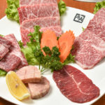 和牛特選カルビ、和牛中落ちカルビ、和牛ロース、特上厚切りタン、みすじ、鹿児島産和牛の人気部位を盛り合わせた豪華な牛角人気盛り(1,880B)