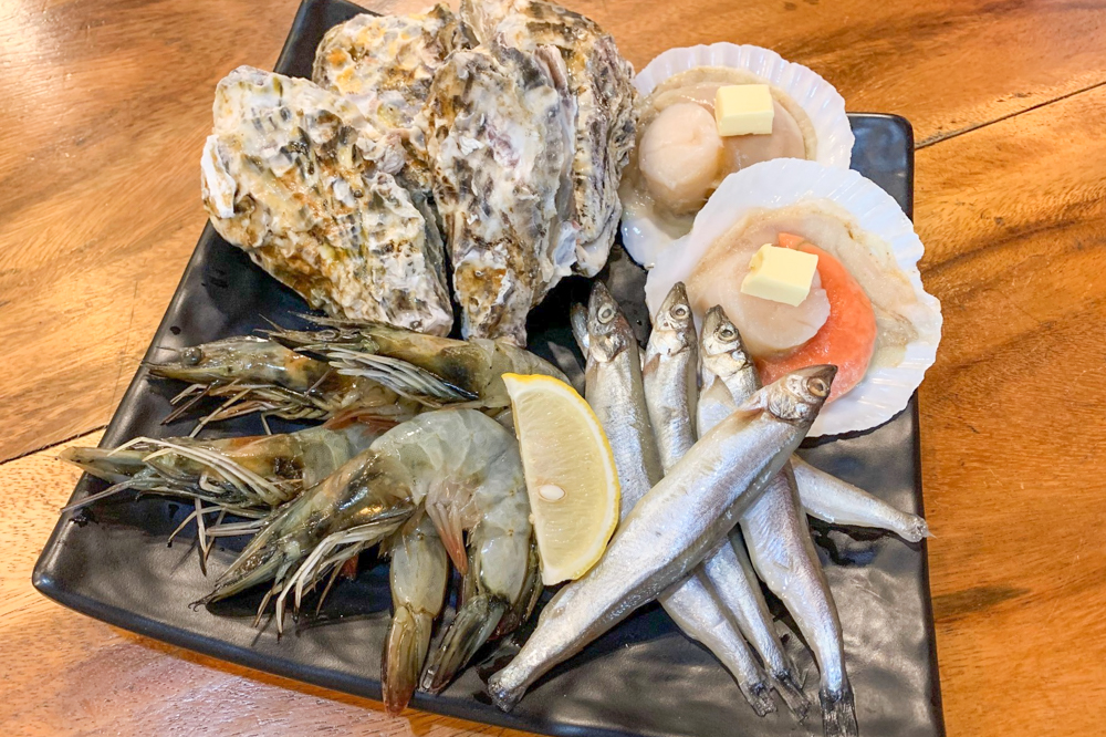 海鮮コンボ(666B)は大きな有頭海老、帆立、ししゃも、牡蠣が揃い踏み