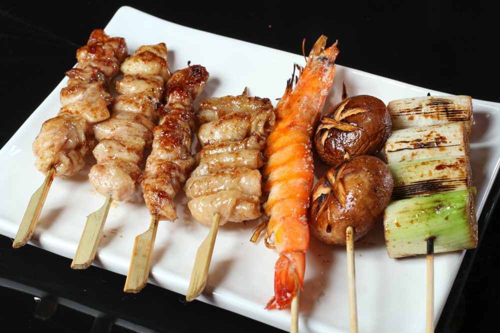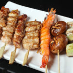串焼き盛合わせ(248B)は人気の串をおまかせで7本。酒がぐいぐい進むことこの上ない