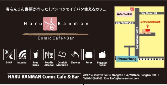 春らんまんコミック カフェ&バーの基本情報 店舗名春らんまんコミック カフェ&バー カテゴリ洋食 地域プロンポン北地区 お一人様予算120 THB 〜 住所20/12 Soi 39, Sukhumvit Rd. (マイポーチの横) 電話番号02-100-9102 営業時間24時間営業 定休日なし クレジットカード- 座席数 個室情報 税金 サービス料 お通し代 ウェブサイトhttps://www.haruranman.com 地図