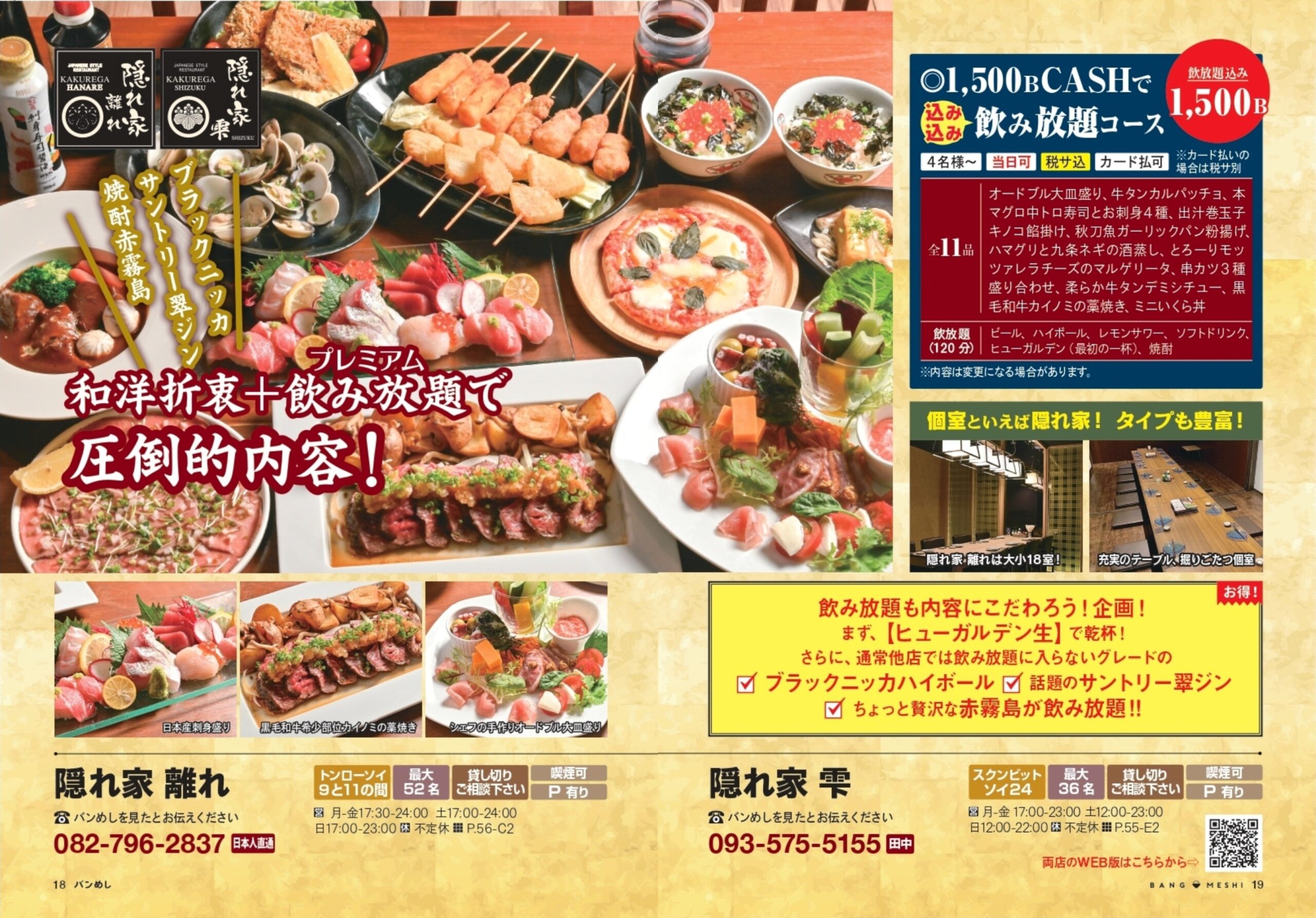 ビール、ハイボール、レモンサワー、ソフトドリンク、ヒューガルデン(最初の一杯)、焼酎 ※内容は変更になる場合があります。最低人数 |4名様より 最大人数 |52名様まで カード払 |可 予約 |当日可 消費税 |込(現金の場合) サービス料|込(現金の場合) ※カード払いの場合は税サ別 喫煙 |可