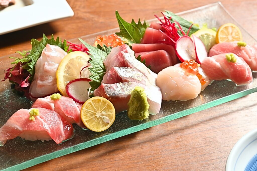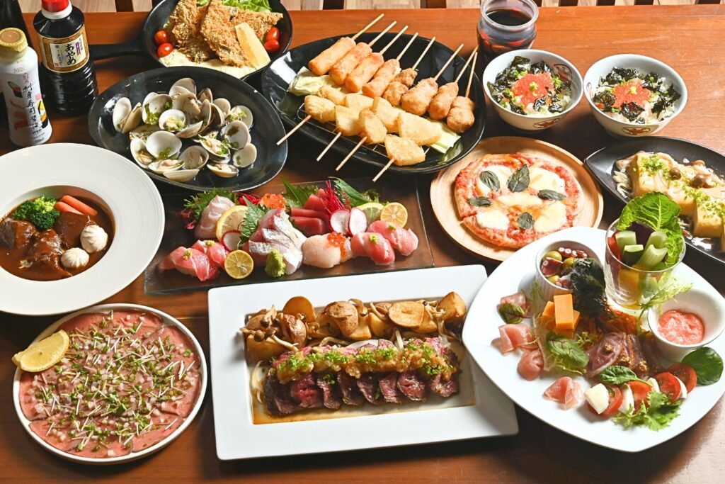 ・オードブル大皿盛り ・牛タンカルパッチョ ・本マグロ中トロ寿司とお刺身4種 ・出汁巻玉子キノコ餡掛け ・秋刀魚ガーリックパン粉揚げ ・ハマグリと九条ネギの酒蒸し ・とろーりモッツァレラチーズのマルゲリータ ・串カツ3種盛り合わせ ・柔らか牛タンデミシチュー ・黒毛和牛カイノミの藁焼き ・ミニいくら丼