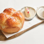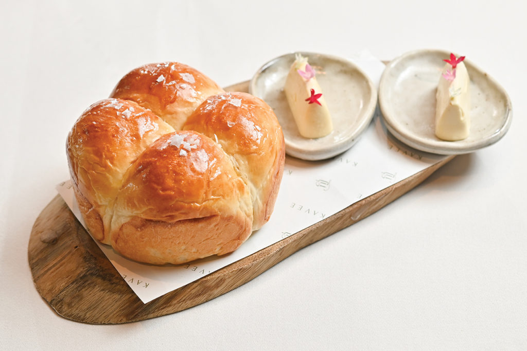 やわらかくしっとりと焼き上がった自家製ブリオッシュ。トップにはタイ産の天然塩。バターはタイの醤油「シーイウ」をミックスしたもので、ブリオッシュの甘みと程よい塩味に加え、シーイウならではの深みとタイらしさが融合したとても面白い味に仕上がっている。