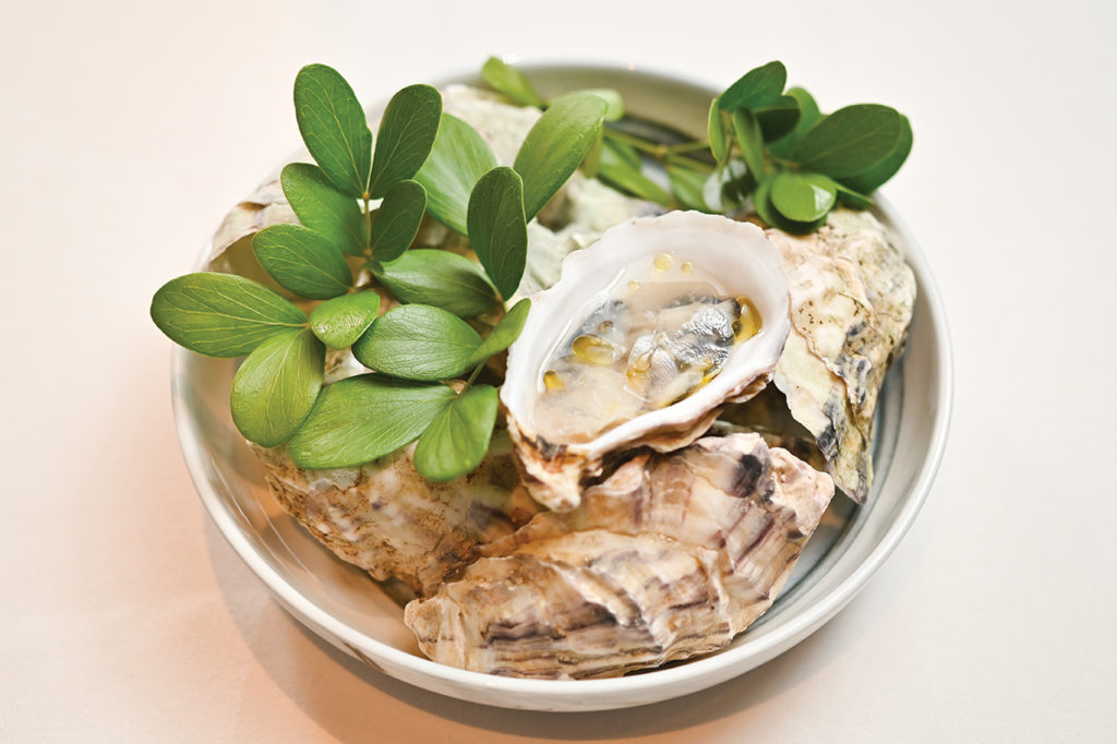 程よい身の締まりと、とろけるような柔らかさが特徴のブルターニュ産生牡蠣。味付けは、オリーブオイルベースの爽やかなソース。パイナップルとグアバが加えられており、フルーティーな香りが身の締まった牡蠣とよく合う。シェフ曰く「パイナップルとグアバをミックスすると、青リンゴのような香りになるんだ」と。本当に青リンゴが入っているかのような香りがします。