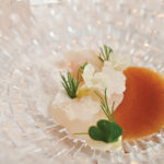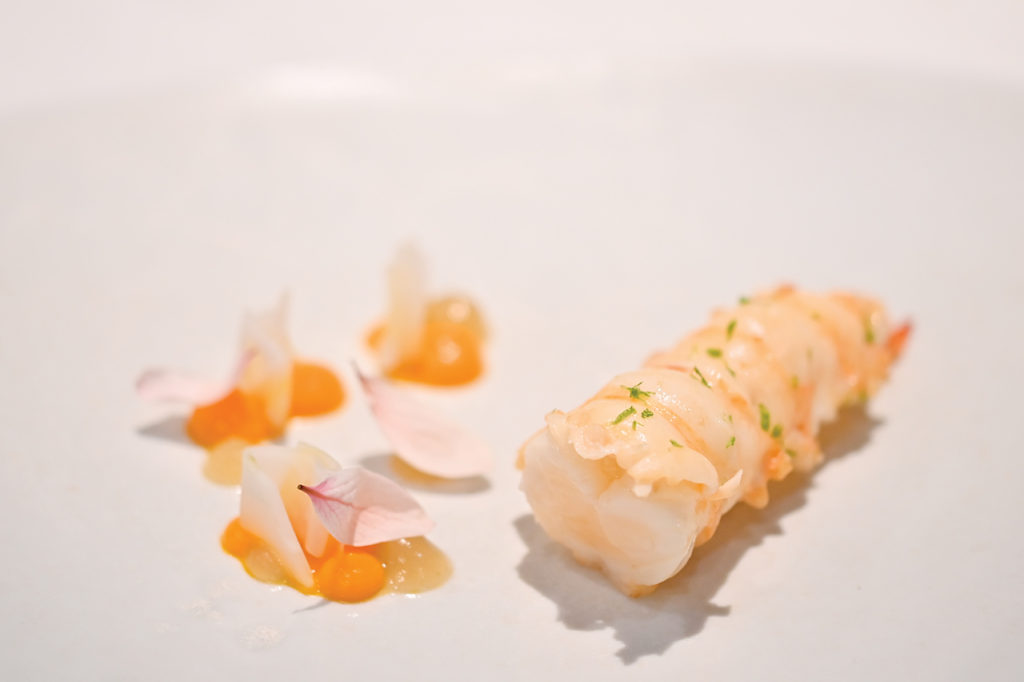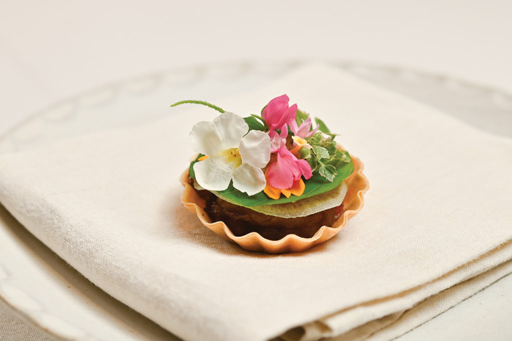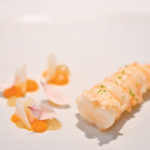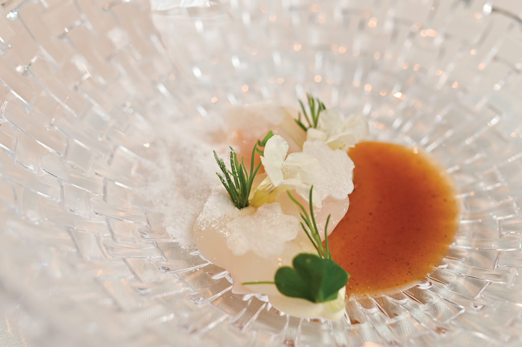 タイ料理をベースとした一品。タイ醤油(シーイウ)でマリネされた生海老に、ごま油・お酢・シアントロ・ガーリック・しょうがを加えた自家製ソースが加わる。可愛らしくトッピングされたエディブルフラワーは、シェフの自宅の庭で家庭菜園されているもの。ワンバイトでいただける前菜となっている。