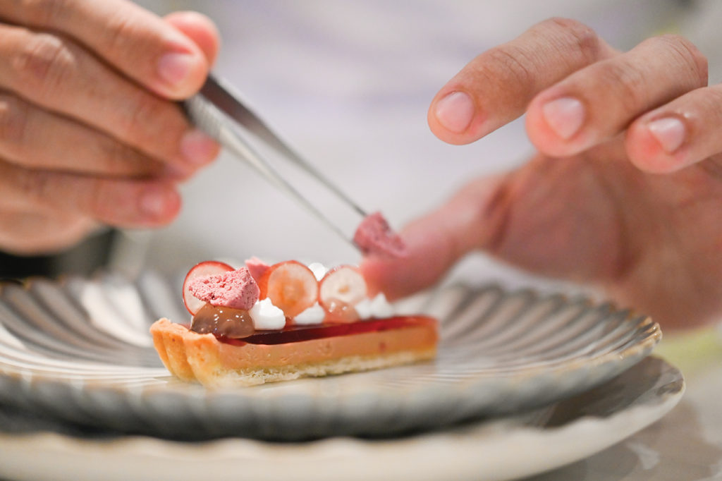 フォアグラとダックレバーがメインの、斬新なお食事タルト。ダックレバーはカオヤイの農園で育った鴨を使用。タルトソースは、グレープとアップルでできたもの。トッピングには、スライスされたグレープ、クラジアップ・デーン(Roselle タイのハイビスカス)でできたパフ、ココナッツクリームソースが盛り付けられ、タイらしさが加わる。フォアグラとレバーのもつ塩味と、フルーツが醸す甘味との融合、そしてほのかな南国の香をも楽しませてくれる一品。