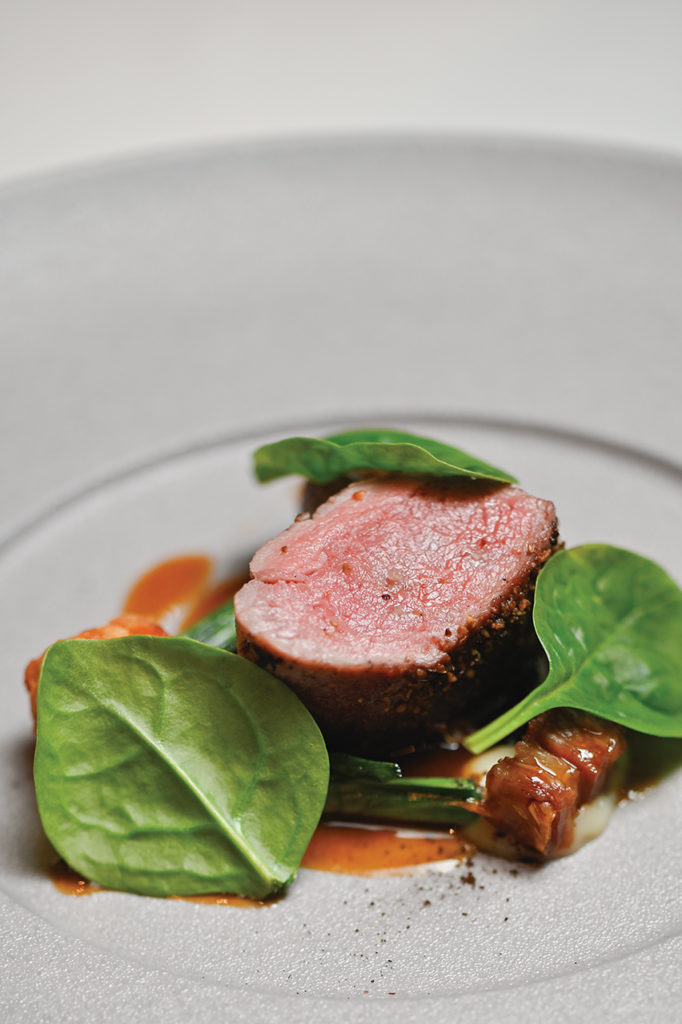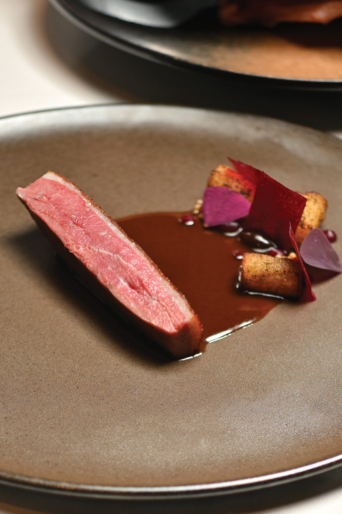 2週間かけて乾燥熟成させた鴨肉は、カオヤイのオーガニーックファームから。その後2時間かけてスモークすることで、外側がパリッと仕上がる。クリスピーな仕上がりとやわらかな赤身のお肉がたまらなく美味しい。ソースは、シナモン・コリアンダーなど、タイのアーバンスパイスをブレンドしたもの。付け合わせのプルーン、ビーツ、ポテトもgood。