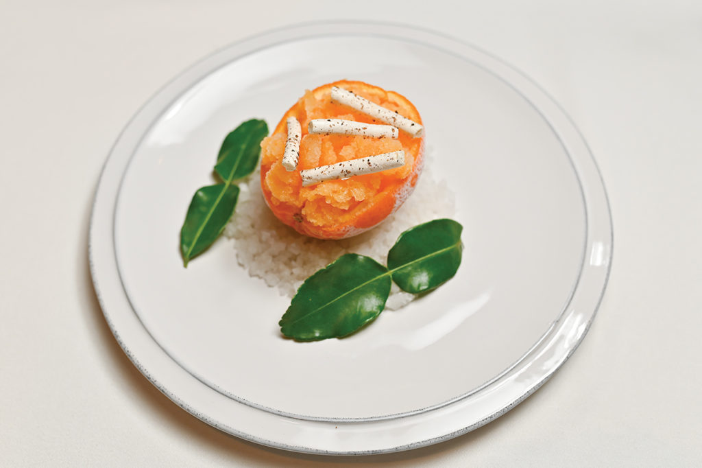 チェンマイ産のオレンジに、パイナップル、パッションフルーツ、ミント、そしてココナッツクリームが添えられており、タイらしさを感じられる一品。トッピングには山椒が使われており、爽やかな果物ととても相性がよい。