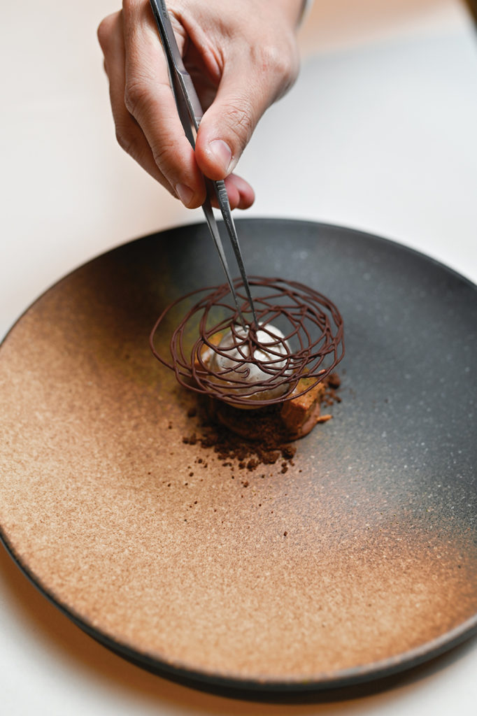 タイのアイスクリーム屋台からインスピレーションを受けたデザート。濃厚な黒トリュフが贅沢なアイスクリームに、クラッシュしたピーナツとカカオが添えられ、甘味と塩味のほどよいバランスを味わえる。トッピングされたチョコレートは、店内を彩るライティングオブジェをイメージしているとのこと。