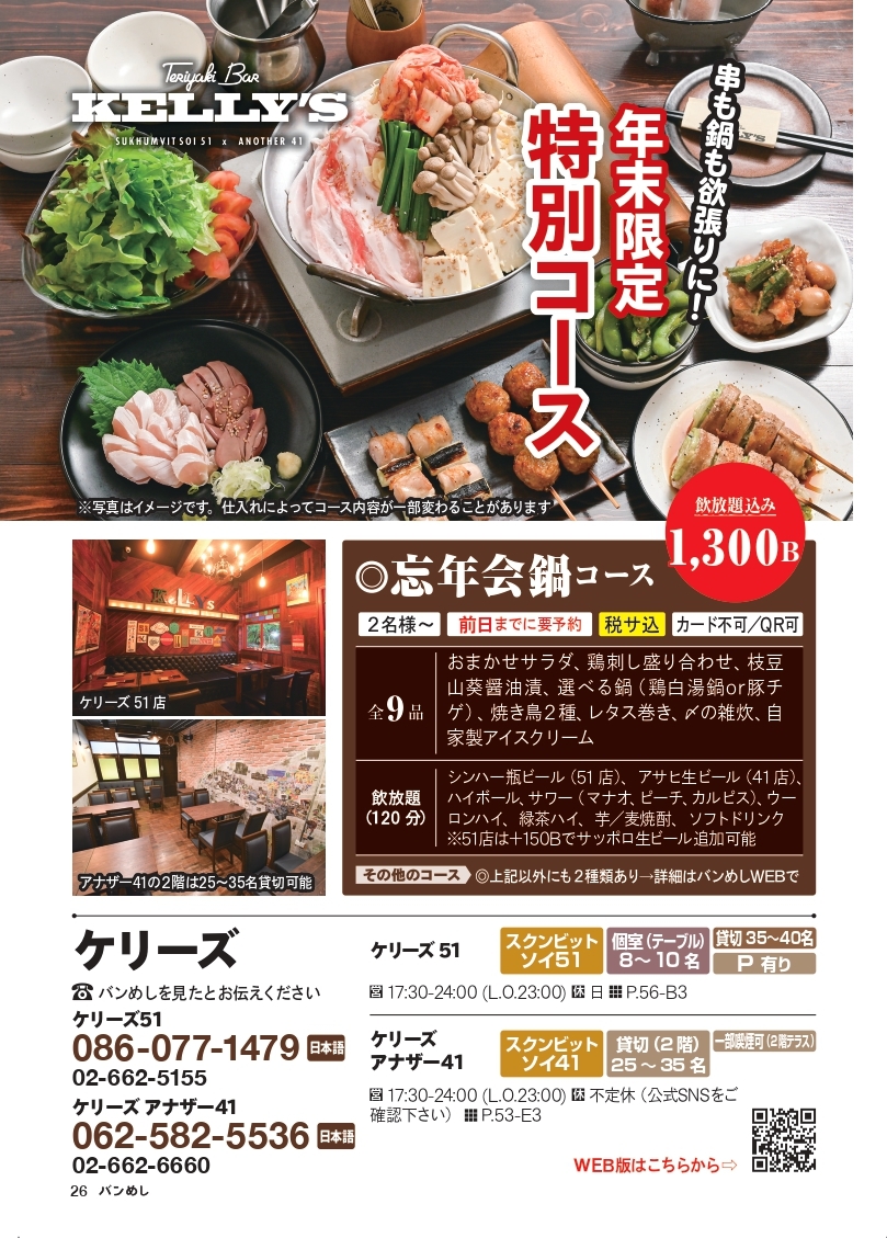 シンハー瓶ビール(51 店)、アサヒ生ビール(41 店)、ハイボール、サワー(マナオ、ピーチ、カルピス)、ウーロンハイ、緑茶ハイ、芋/麦焼酎、ソフトドリンク ※51店は+150Bでサッポロ生ビール追加可能最低人数 |2名様より 最大人数 |40名様まで カード払 |可 予約 |前日までに要予約 消費税 |込 サービス料|込 喫煙 |一部喫煙可