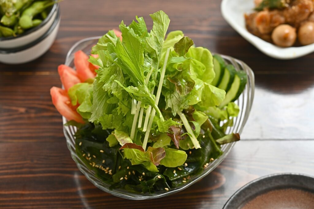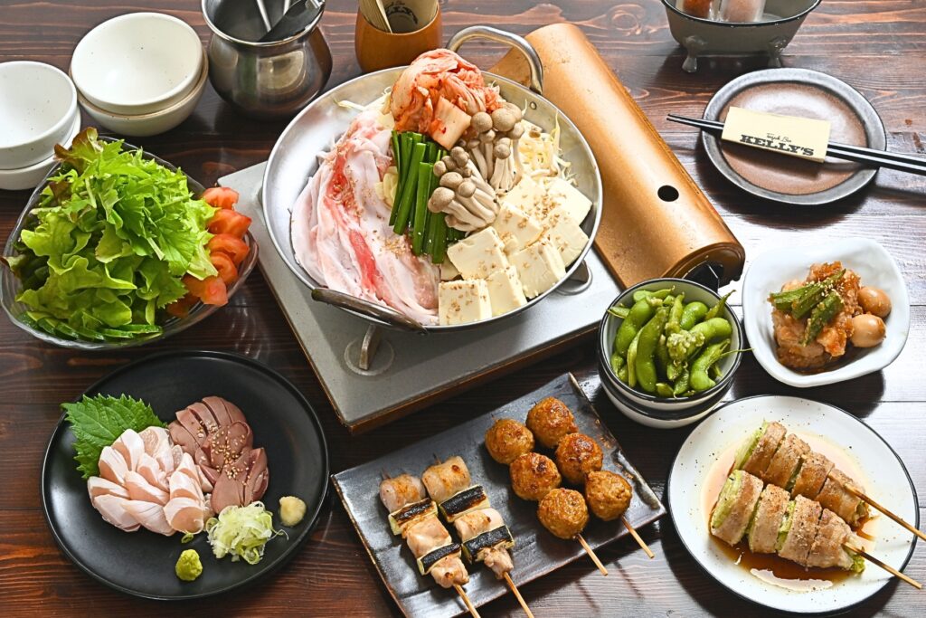 ・おまかせサラダ ・牛タン刺 ・鴨のカルパッチョ ・カキの味噌鍋 ・焼き鳥2種 ・レタス巻き ・鍋の〆味噌煮込みうどん ・自家製バニラアイス ※写真は「忘年会鍋コース」です