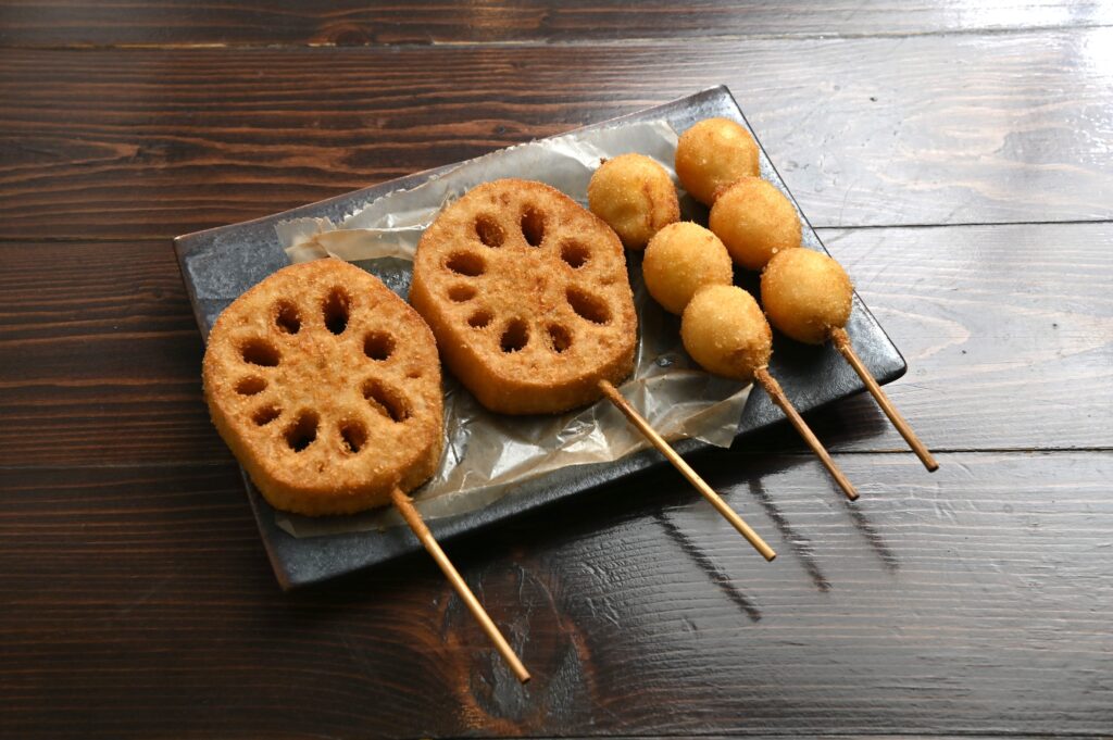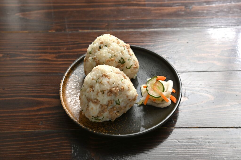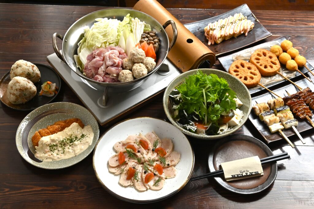 ・棒々鶏サラダ ・出汁巻玉子 ・鶏唐揚げ ・ピリ辛鶏もつ煮込み ・焼鳥3種(+80Bで串揚げ2種追加) ・悪魔のおにぎり(+80Bでナポリタン変更可)