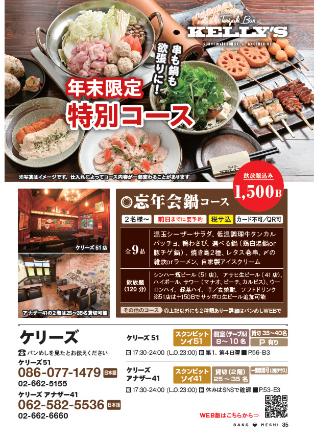 シンハー瓶ビール(51 店)、アサヒ生ビール(41 店)、ハイボール、サワー(マナオ、ピーチ、カルピス)、ウーロンハイ、緑茶ハイ、芋/麦焼酎、ソフトドリンク ※51店は+150Bでサッポロ生ビール追加可能最低人数 |2名様より 最大人数 |35名様まで カード払 |不可/QR可 予約 |前日までに要予約 消費税 |込 サービス料|込 喫煙 |一部喫煙可(2階テラス)