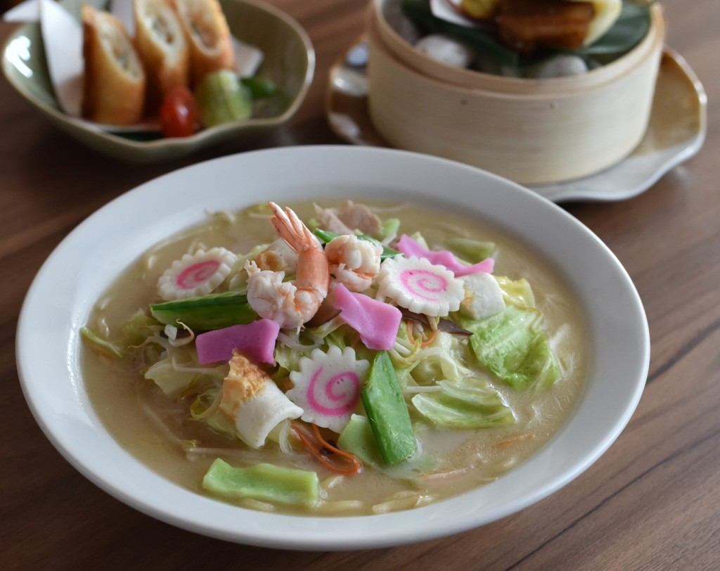 長崎の自社工場で作る麺とスープを直送し、職人が一杯ずつ中華鍋を振って作るこだわりのちゃんぽんが評判。ハトシや角煮饅頭、カステラアイスなど、長崎名物が勢ぞろいします。